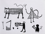 Jodhaiya Bai Baiga was born in 1938 in the Lorha village of the Umaria District, Madhya Pradesh. She earned a living by selling wood and cow dung in her village until her late 60s, when she met late artist Ashish Swami who began to mentor her and encouraged her to develop her practice as a folk artist. While speaking with author, collector and folk art revivalist Mitch Crites, Baiga mentioned how transformative painting had been for her as it allowed her the freedom to reimagine her world with her own hands. Her work is composed with a vivid palette and dynamic perspective that celebrates the traditional grammar of Baiga art and its subjects that convey the community’s deep kinship with nature. She has also painted contemporary scenes of man-made destruction, using ancestral forms of painting to communicate the ongoing violence of erasure and harm to her environment in inventive, authentic ways.
