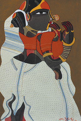 Thota Vaikuntam hails from Andhra Pradesh, in South India, and finds his inspiration in the rural areas of the state. Men and women of his village are often the central characters of his work. Telangana women, in particular, are frequent subjects for his works. The obsession can be traced back to his childhood, when he used to be fascinated by the male artists who used to impersonate female characters in the travelling theatre groups that performed in his village. He admits finding the women of his village very sensuous and that he only attempts to capture their vibrancy.