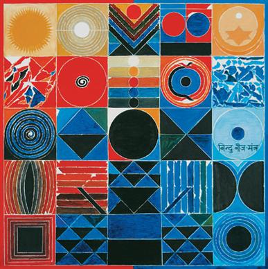 Unlike, the work of the British Optical artists, however, who showed a similar preoccupation with geometry, in Raza`s oeuvre, these shapes are permeated with spiritual significance. While in Op art, geometric shapes were exploited for their ability to create the illusion of movement, serving as an investigation of the physical impact of pictorial data, Raza`s images seek to go deeper than the world of experienced reality. "In his canvases, geometric forms are used to map the universe. Here, the vocabulary of pure plastic form acquires an integral purpose: to relate the shape and rhythm of these forms to Nature." (p. 118, Geeti Sen, Ibid.) The title of this painting, Bindu Bija - Mantra, as well as the images the `Bindu` and the `Bija`, crystallizes the metaphysical preoccupations of Raza`s aesthetic. Central to Raza`s paintings from the 1970s, the Bindu or black void symbolizes the starting point of universe. The `Bija` or seed is a reference to Raza`s preoccupation with germination as the source of all life and `Mantra` or chant gestures to the Tantric basis that underlines much of the artist`s painterly endeavors.