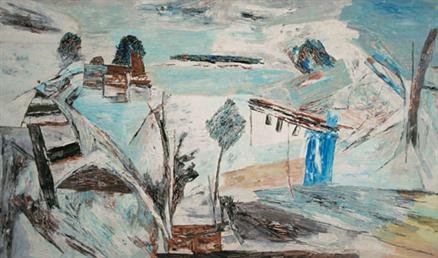 This particular painting of Varanasi marks an interesting turning point in Ram Kumar`s creative vision. In the 1990`s architectural constructs began to insert themselves into Ram Kumar`s depictions of fragmentary landscapes. Varanasi is a hybrid interlocking of the disparate physical characteristics of the city, both its manmade constructions as well as its natural attributes. The painting has a buoyant air, achieved through Ram Kumar`s uncharacteristic use of blue. "With broad, fluid handling, Ram Kumar dismantles the city: its earthworks are broken and rephrased along the flanks of valleys, laid out on highland pastures, gathered into the pure abstract motion of swirl and fall." (p. 41, Ranjit Hoskote, "The Poet of the Visionary Landscape", Ibid.)