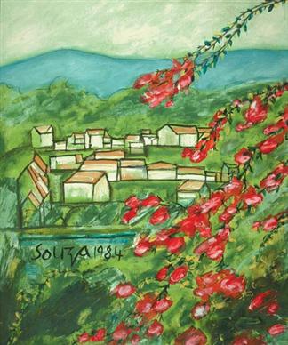Souza`s lines are a vital feature of his aesthetic. Often considered at their most evocative in his renditions of the human form, Souza`s landscapes are equally fascinating in their manipulation of the line. In the Cherry Tree, Souza`s bold black lines create a sense of structure reminiscent of Cézanne. The solidity of the houses forms an exciting contrast with the fluid red brushstrokes used for the cherry tree. The painting possesses a sense of merriment that is unusual in Souza`s oeuvre.