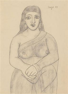 Francis Newton Souza's unrestrained and graphic style created thought-provoking and powerful images. His repertoire of subjects covered still life, landscape, nudes and icons of Christianity, rendered boldly in a frenzied distortion of form. Souza's paintings expressed defiance and impatience with convention and with the banality of everyday life. Souza's works have reflected the influence of various schools of art: the folk art of his native Goa, the full-blooded paintings of the Renaissance, the religious fervour of the Catholic Church, the landscapes of 18th and 19th century Europe, and the path-breaking paintings of the moderns. A recurrent theme in his works was the conflict in a man-woman relationship, with an emphasis on sexual tension and friction. In his drawings, he used line with economy, while still managing to capture fine detail in his forms. He also used a profusion of crosshatched strokes that made up the overall structure of his subject.