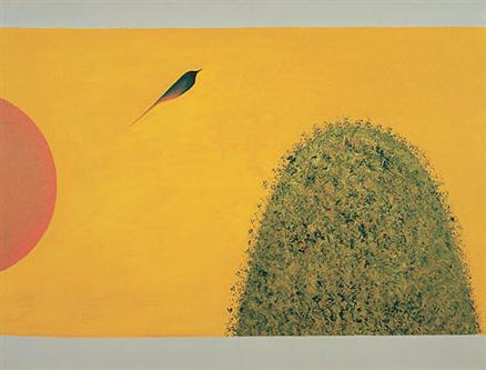 Swaminathan`s art subtly evades definition. Inspired by the overt simplicity of tribal art and the simulated child-like innocence of Paul Klee`s canvases, his elemental structures are nonetheless entirely his own. In this 1983 work, the vivid hues vibrate against each other creating unexpected resonances and the highly stylized, somewhat geometric, delineation of the bird, sun and hill merely hints at a representation of the natural world. In fact, the work is not concerned with the portrayal of phenomenal reality. "He managed to dissociate common phenomena from its natural associations and lodge it as it were, in a universe of mystery and wonder, creating images which are about to reveal themselves but never quite do so." (p. 2, Krishen Khanna, J. Swaminathan, Contemporary Indian Art Series, Lalit Kala Akademi, 1995)