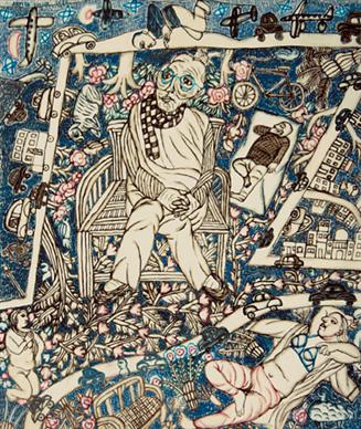 "Arpita Singh has pushed the visual lexicon of the middle-aged woman further than almost any other woman artist. The anomaly between the aging body and the residue of desire, between the ordinary and the divine and the threat of the violent fluxes of the impinging external world gives her work its piquancy and edge. At the same time she critiques the miasma of urban Indian life with suggestive symbols of violence that impinge on the sphere...