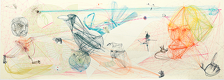 Aditya Pande’s large format works are made up of masses of undulating lines and frantic concentric circles, making each piece appear as if it is made up of several whirlpools of energy. The viewer’s focus constantly shifts from one density to another, some with movements that draw the eye inwards while others seem to spring out of the surface with wild abandon.