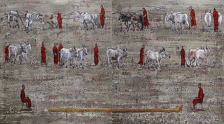 G R Iranna is an artist whose work transcends the boundaries of time and space. Born in 1970, its been barely ten years since he started painting professionally, and already his work is mature and profound.