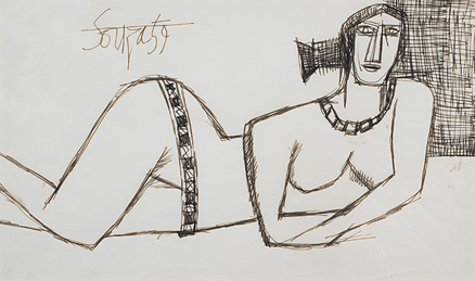 Francis Newton Souza's unrestrained and graphic style created thought-provoking and powerful images. His repertoire of subjects covered still life, landscape, nudes and icons of Christianity, rendered boldly in a frenzied distortion of form. Souza's paintings expressed defiance and impatience with convention and with the banality of everyday life. Souza's works have reflected the influence of various schools of art: the folk art of his native Goa, the full-blooded paintings of the Renaissance, the religious fervour of the Catholic Church, the landscapes of 18th and 19th century Europe, and the path-breaking paintings of the moderns. A recurrent theme in his works was the conflict in a man-woman relationship, with an emphasis on sexual tension and friction. In his drawings, he used line with economy, while still managing to capture fine detail in his forms. He also used a profusion of crosshatched strokes that made up the overall structure of his subject.