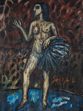 Souza's fascination with the female figure and the nude dominated a large body of works. He admired and held them in fear, and this conflict is apparent in many of his paintings. They carried a personal stamp, filtering the subject through the artist's eyes for the viewer. Writing about his approach to the nude, art critic Edwin Mullins noted, "He treats the erotic in several ways....His nudes are only occasionally painted as beautiful or even...