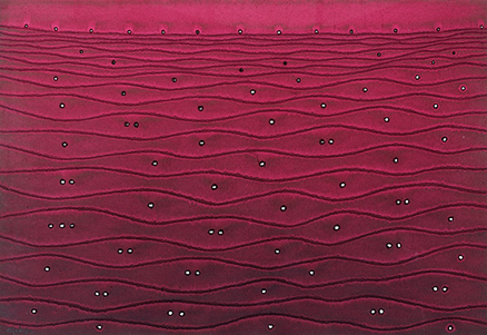 Although he began his career in the 1950s painting in oil on canvas, he worked on paper almost exclusively from the 1980s. In his process, he covered the surface of the paper with structural effects by soaking it in liquid and carving it in several stages while applying inks and dyes. The striated two-dimensional paper was ultimately transformed into a three-dimensional medium. The repetition of careful incisions on the paper was an integral part of his meditation.