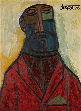 1956 was a seminal year for Souza, following his 1955 successful debut into the London arts and literary fraternities – an achievement won after much struggle. His first solo show at Gallery One was very well received, as was his first publication, a semi-autobiographical essay, Nirvana of a Maggot. Riding on the crest of this wave of successes, the artist’s output in the mid to late 1950s comprised some of his best works, including several important portraits like this piece. Mirroring both his dry sense of humor, and a more serious reflection on the social forces that influence the human condition, Souza’s portraits offer us insight not only on the artist’s life, but are also a significant source of disfigured his social commentary. This work, Man in a Red Coat, may seem quite benign on first inspection; nevertheless, as is the case with his other paintings from the period, the relevance of this piece derives from Souza’s personal experiences. Bestowing him with a mask-like, robotic countenance, Souza robs his subject of all autonomy. The glaring red of the man’s coat scorns the inanimate red-tape that has come to exercise much control over everyday life, suggesting the reduction of humans to pawns blindly navigating a bureaucratic maze. Containing his figure within thick, dark outlines, the artist emphasizes his irreverence for such an existence, so different from his own.