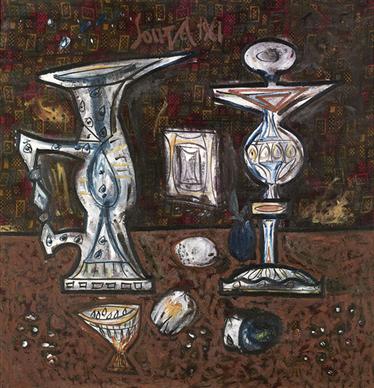 In this still life, Souza presents Catholicism as nothing deeper than decorative vestment and ceremony – an ornamental faith based on words and objects rather than people. As the critic Yashodhara Dalmia explains, Souza’s still-lifes like this one “reflect liturgical practices and often consist of sacred objects or biblical references” (The Making of Modern Indian Art: The Progressives, Oxford University Press, 2001, p. 92). Instead of mocking its priests and saints, as he does in several of his figurative canvases, here the artist questions the rituals and symbols of the Roman Catholic Church. With his characteristic strong line and a less frequent, even unusual intensity of decoration and detail, this piece from 1961 was painted at the zenith of Souza’s fame in London, a period in which he repeatedly invoked religious themes to question divine knowledge and organized faith.