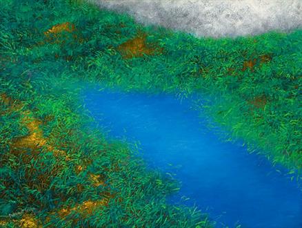 Singh’s brush charts a course on the canvas that gives the viewer panoramic visions of mystic landscapes. The bush, coated with thick pigment, does not rest before it has filled the entire surface; before the paint has ensured that all the natural forms in the frame have been given a colourful, tactile presence. The dappled areas of the sky and water too are rendered with a tactile feel. The lines etching out the grass, the leaves, the peduncle, seem to be possessed by a mysterious, lyrical musicality.