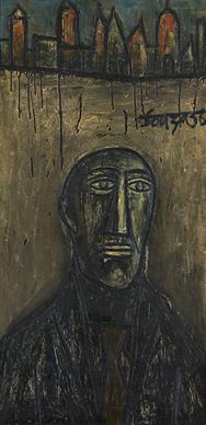 This particular piece is also significant in terms of its style. Though Souza employed his characteristic heavy impasto and the aggressive black lines that were inspired by the works of Rouault, Sutherland and Soutine in its creation, this work is particularly significant in its lack of violence and disfiguration of the central character. Combining his iconic townscapes with his equally infamous heads in this work, it seems at first that Souza has forsaken the eroticism, satire and religious commentary that were his trademarks at the time, for a simple man about town, dressed in a suit and tie.