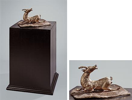This work comprises of the following: A bronze deer measuring Height: 6 inches Width: 9.5 inches, Depth: 3.5 inches A bronze plate measuring Height: 1.5 inches Width: 10 inches, Depth: 12 inches A base made of wood measuring Height: 24 inches Width: 17 inches, Depth: 17 inches