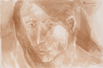 Padamsee’s interest in structure and form takes shape from landscapes, and is borne from an interest in Sanskrit texts such as the Abhijanashakuntalam . His Mirror Images reflect a concern with the duality of existence. His portraits and heads are treated with the same interest in constructing form rather than in the specifics of portraiture. The only occasion when he created identifiable portraits was in 1997, with his “Gandhi” series of works on paper in watercolour and charcoal.
