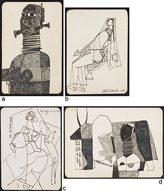 b) Untitled Signed and dated 'Sultan Ali 1962' and in Devnagari (upper left); signed again in Gujarati (upper right) 1962 Ink on paper 7 x 5 in (17.5 x 12.5 cm) c) Untitled Signed and dated 'Sultan Ali 1962' and in Devnagari (lower right) 1962 Ink on paper 7 x 5 in (17.5 x 12.5 cm) d) Untitled Signed and dated 'Sultan Ali 1963' and in Devnagari (lower left) 1963 Ink on paper 5 x 7 in (12.5 x 17.5 cm)
