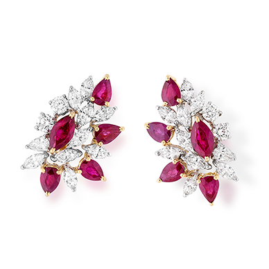 Stylised asymmetrical cluster comprising full-cut, pear-shaped and marquise-shaped diamonds, interspersed with marquise-shaped and pear-shaped rubies, mounted in gold.