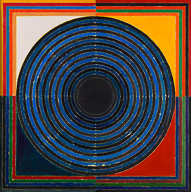 "I have no apology for my repetition of the form of the bindu. With repetition you gain energy and intensity - as is gained through the japmala, or the repetition of a word or a syllable until you achieve a state of elevated consciousness." - S H Raza Raza and the Bindu are by now, synonymous. Kundalini , painted in 1996, is a bold and mature work with a black Bindu dominating the centre of the painting. For the artist, the Bindu represents the primordial symbol of energy, "a point, which could be enlarged to a circle-one of the most significant geometrical forms." (The artist quoted in Geeti Sen, Bindu: Space and Time in Raza's Vision , New Delhi: Media Transasia India Ltd., p. 126) The Bindu was the basis for a transformation in the artist's career in the late '70s, where his paintings transitioned from gestural works into geometric abstraction. The inspiration behind the Bindu came partly from his "preoccupation with formal order" and geometry, in which he experimented with variations of "the point, the line, the diagonal, the triangle, the square and the circle," in addition to exploring nature and spirituality. "Eventually, these experiments led him to a resolution where these two preoccupations merged, one into the other." (Sen, p. 134) Raza explains, "For me at that initial stage, bindu not only represented the primordial symbol or the seed. It also represented for me a point, which could be enlarged to a circle - one of the most significant geometrical forms." (the artist quoted in Sen, p. 126) Raza uses geometric shapes to denote the cosmos and its constituent components. The circle forms the central element in this expression and is the essence of life. Raza's work delves deep into Hindu philosophy and metaphysics. In some holy scriptures such as the Upanishads , different geometric forms denote specific elements such as water, earth, air and fire, which form the basis of all life and creation. All elements of Raza's exploration come into play in the present lot, in which the black Bindu is contained within the centre by colourful, radiating circles. Raza invokes the panchatattvas or the five elements of nature, each represented by a single colour. Raza states, "With the bindu, I discovered that a whole series of different climates of thought can be created... I have interpreted the universe in terms of five primary colours: black, white, red, blue and yellow." (The artist quoted in Sen, p. 127)