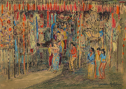 Signed and dated 'Hebbar '60' (lower right); signed, dated and inscribed 'K. K. Hebbar / Bali / 1960 / festival' (on the reverse)
