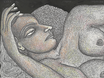 Signed in Bengali (upper centre), dated in Bengali (upper left), signed and dated again 'Jogen 2016' (upper right); signed, inscribed and dated 'Jogen Chowdhury / "The beautiful Face" / 2016 (Santiniketan)' (on the reverse)