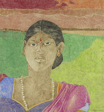 When one looks at Goud’s work, rustic, raw, and potent might be the first words that come to mind. His portraits of men and women represent the dynamic Indian ethos rather than particular individual identities. A recurrent theme with the artist is that of the erotic, treated as an active and powerful aspect of male and female sexuality and existence. Goud’s work is dramatic; his protagonists are raw and vivacious in their appeal, imbibed with energy that reverberates through his strokes and textures. Most of Goud’s art is centered on the rural, recreating landscapes from his childhood as if they were frozen in time. In the artist’s later work, his figures turn softer, more introspective than brash in their outlook.
