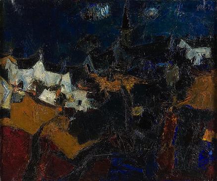 Inspired by the French landscape, Raza's works from the 1950s demonstrate a decidedly Cubist approach, informed by a “sense of order and proportion in form and structure.” (Artist quoted in Geeti Sen, Bindu: Space and Time in Raza’s Vision, New Delhi: Media Transasia Ltd., 1997, p. 57) He exhibited in many group and solo shows in Paris, and his works sold and became part of important collections. Raza had gained widespread recognition in Europe and India as well. He also met his future partner, the artist Janine Mongillat, while studying at art school. Raza and Mongillat got married in 1959 and visited India the same year for an exhibition of Raza’s works organised by the artist and gallery owner Bal Chhabda at Gallery 59 in Mumbai. Following this show, Raza returned to India several times, travelling to his native village—which inspired the bindu motif in later works—as well as other undiscovered parts. These visits to places new and old ushered yet another phase of painting that incorporated his Indian heritage. “Raza was getting himself away from the need to paint what he saw, he was drawn more to paint what he recalled... It was not romantic nostalgia but Raza was torn between two worlds: the tumultuous present, the tranquil past. Beauty and fear coming together again as in the beginning of his life.” (Ashok Vajpeyi ed., A Life in Art: S H Raza, New Delhi: Art Alive Gallery, 2007, p. 80)