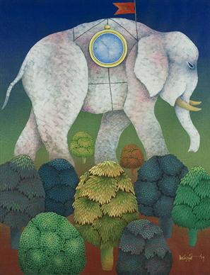 Bizarre images crowd his canvasses and form an integral part of his art: images that float in the air, survey the world with their legs pointing skyward, distorted beyond recognition. He explains, "If some of the figures in my paintings are seen suspended in the air and others, upside down, it is so because I am trying to present the predicament of a middle-class man, who does not have a secure foot-hold in our society, who has to make compromises, face disappointments and whose dreams and aspirations are invariably turned down."