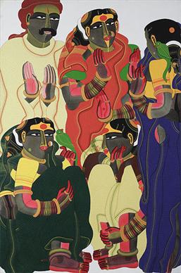 Thota Vaikuntam hails from Andhra Pradesh, in South India, and finds his inspiration in the rural areas of the state. Men and women of his village are often the central characters of his work. Telangana women, in particular, are frequent subjects for his works. The obsession can be traced back to his childhood, when he used to be fascinated by the male artists who used to impersonate female characters in the travelling theatre groups that...