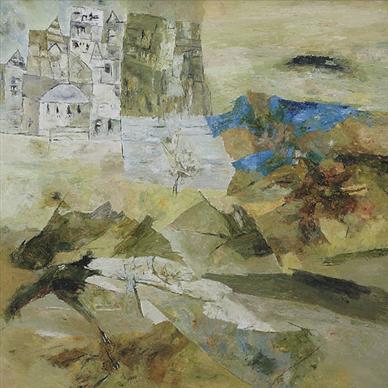 In this piece, from 2002, it is the open landscape that dominates the canvas. Rocky hills in the foreground and verdant plains rolling into the distance overshadow the manmade houses and temples. The architecture, reminiscent of the artist`s earlier Benares cityscapes, is consumed by the landscape, a fading reminder of the worldly ties renounced by `pilgrims` like the artist, who search for transcendence in the purity and openness of nature.