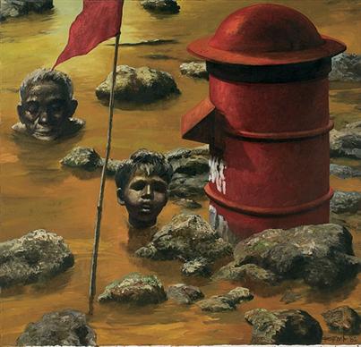 Improbable characters (both psychologically and physiologically) play a role on the canvas and dominate his oils. Yet his work is a powerful combination of realism and fantasy, where reality sets the ball rolling and fantasy helps the canvas assume a new reality.