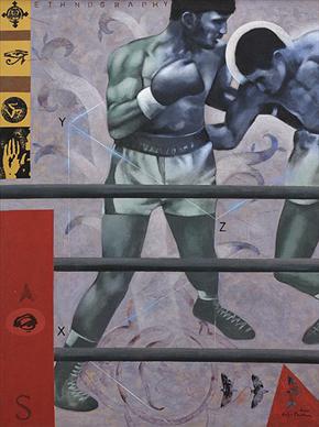 In this piece, Parthan pits two boxers against each other in the midst of the hieroglyphic and entomological icons that border the canvas. While one contestant is haloed, the other is not, perhaps representative of the eternal battle raging between the forces of virtue and vice, rephrased in a contemporary idiom. However, as the title suggests, the artist seems to have uncovered, through an ethnographic study, that this eternal encounter is no more than a façade – a ticketed match to entertain the masses. Like every other element of our present realities, it is a construction, a part of the matrix of data in which we function.