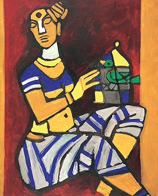 Husain's paintings of women recall the beauty and classical poses seen in Mathura sculpture. He often introduced symbols such as lamps, spokes, umbrellas, elephants and horses, which defied simple interpretations. These juxtapositions incorporated mythology and storytelling, and sometimes tapped into "the deeper, inchoate reaches of emotion." (Richard Bartholomew and Shiv S Kapur, Husain, New York: Harry N Abrams, Inc., 1971, p. 36) In...