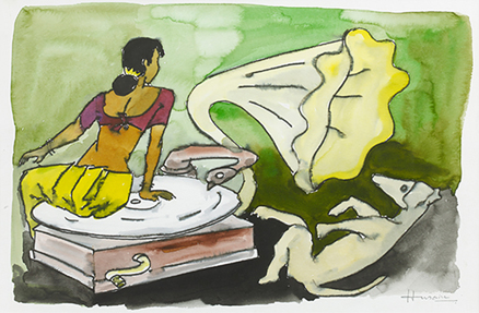 In this charming watercolour, Husain turns to the nostalgia of the beloved HMV logo of the dog and the gramophone. His Master's Voice is the title of a painting by Francis Barraud, in which Nipper the dog listens to a cylindrical phonograph. The Gramophone Company rebranded the image by replacing the phonograph with what is now the iconic wind-up gramophone. In a playful take on the familiar image, Husain shows the canine in a home...
