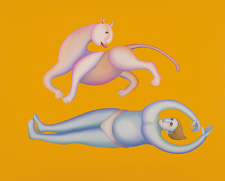 "Connoisseurs of art have spoken about the folk and tribal background of my work, the courageous display of colours in my paintings has been commented on, and the incorporeal aspect of my imagery has been dissected. I would like to believe that behind all this, a creative warrior's spirit must have been at work... I am the one who has fought his own battles." - MANJIT BAWA Manjit Bawa's art is unlike that of any of his post-Independence contemporaries. Born in Dhuri, Punjab, in 1941, he trained with B C Sanyal, Dhanraj Bhagat and Somnath Hore at the College of Art in New Delhi and later in London. Deceptively simple and striking, his work draws from a range of literary and visual traditions. The imagery in his paintings is informed by his familiarity with a wide range of religious texts and literature, including Sufi poetry and literature, as well as the history and tales of bravery from the Sikh tradition. His canvasses offer up allegory based on scriptures as well as folklore with equal ease. Rajput and Pahari miniatures play a role in his choice of colour and composition, and the smooth, uniform colours are a result of his training in silkscreen printmaking, which he studied in London in the late 1960s. Bawa visited specific mythological themes throughout his career. The present lot, an ochre canvas of epic proportions, consists of a prowling lion, and a supine blue-skinned ascetic. As with most of Bawa's oeuvre, there can be multiple readings of this seemingly simple figurative composition. Bawa was well-acquainted with the stories that abound in religious scriptures. It is possible that the feline creature is inspired by a verse from the Bhagavad Gita in which Krishna refers to his many manifestations, one of which is a lion: "Among the Daitya demons I am the devoted Prahlada, among subduers I am time, among beasts I am the lion , and among birds I am Garuda" The lion and supine figure might also be a reference to Kali, who has been a source of inspiration to artists through the ages, including Tyeb Mehta (lot 33). According to the narrative, Kali is consumed by rage after vanquishing demons, and is about to destroy the universe. Shiva attempts to assuage her by throwing himself beneath her feet. She is eventually overcome by remorse, and calms down. The tiger is the vahana or vehicle of Kali. Bawa was known for paring down figures to their essence and through this rendition of a tiger or lion like creature and a blue human with conical locks, he evokes not just powerful mythologies but also the complex binaries of dominance and submission, and of rage and pacification. At another level, the present lot highlights Bawa's preoccupation with how "...humans and animals engage in a wordless dialogue that throws its participants back onto an older, nearly forgotten language of instinct and intuition. Standing before these paintings, we realize that Bawa has long been preoccupied with the theme of a universal language of communication. How, he appears to ask, do humans and animals account for one another's presence, share their responses?" (Ranjit Hoskote, Manjit Bawa: Modern Miniatures, Recent Paintings , New York: Bose Pacia, 2000) The lion and the man in the present lot, similarly exist in a world that is whole and complete within the boundaries of the ochre canvas which contains them. The present lot, with its nod to the traditional arts is infused by the deep spirituality with which Bawa approached the world. His paintings are unique not only because of his ability to create figures who seem just beyond the pale of definition, but because they are imbued with a sense of humanity which binds all living creatures.