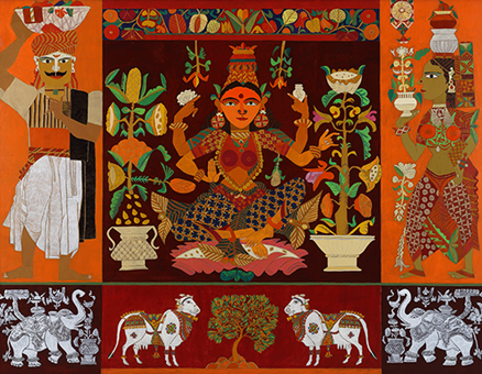 When one looks at Goud’s work, rustic, raw, and potent might be the first words that come to mind. His portraits of men and women represent the dynamic Indian ethos rather than particular individual identities. A recurrent theme with the artist is that of the erotic, treated as an active and powerful aspect of male and female sexuality and existence. Goud’s work is dramatic; his protagonists are raw and vivacious in their appeal, imbibed with energy that reverberates through his strokes and textures. Most of Goud’s art is centered on the rural, recreating landscapes from his childhood as if they were frozen in time. In the artist’s later work, his figures turn softer, more introspective than brash in their outlook.