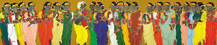 Thota Vaikuntam's vibrant paintings exemplify the customs and people of Andhra Pradesh and Telangana. In the present lot, a monumental canvas depicting Krishna surrounded by gopis, Vaikuntam depicts a traditional subject in a contemporary setting. The facial features and clothing are clearly inspired by the people of Vaikuntam's native Telangana. The figuration finds its roots in Vaikuntam's childhood, when he watched the performances of...
