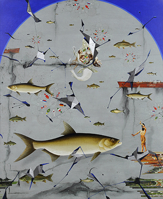 Panda's style of painting is well suited to his concerns, which are with his immediate surroundings: Orissa, the state he hails from, and New Delhi the chaotic conurbation where he now lives. He is sensitive to the issues raised by urbanization and politics. He does not romanticize issues, but attempts to state them as objectively as possible. Though they seem extraordinary, these paintings are not derived from imagination or fantasy. Based on his personal experiences, both as a rural migrant and as a city dweller, they represent the artist's projections about the not-so-distant future. Panda's canvases, may seem light and unassailing, but they reflect the conflicts we create and face on a daily basis, originating, for the most part, in the contemporary and related phenomena of rural exodus, express urbanization, and the resulting crowding and dislocation of life. These conflicts, however, are not exclusive to humans. As Panda understands them, not only do they involve nature, they are pivoted on the constant tussle between environment and development, nature and technology.