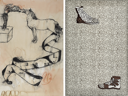 Watercolour and charcoal on paper and embroidery on printed mattress