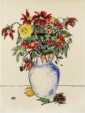 Ara held his first solo show in 1942, at the Chetana Restaurant in Bombay. Since then he has had several other one man and group shows, including many with the Progressive Artists’ Group from 1948 to 1955 in Mumbai, Ahmedabad, Baroda and Calcutta. He had three more solo exhibitions in Mumbai in 1952, 1954 and 1960, and took part in the inaugural show of the Pundole Art Gallery in 1963. In the same year, he exhibited his Black Nude series in Mumbai. In 1955, Ara held shows of his work in Romania, Hungary and Bulgaria. His paintings have also been shown in galleries in West Germany, Russia and Japan.