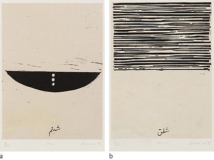 "Black for me is ink. And creating for me is about understanding the heart of darkness in a world which is black and white." - ZARINA Zarina Hashmi-or simply 'Zarina' as she prefers to be known-has always engaged with the politics of home, space and migration. Raised in Aligarh, India, Zarina travelled extensively through Europe, the Middle East, Latin America and Asia, and her works reflect this migratory lifestyle and the multiple meanings of home she derived in the many cities and towns she lived in. Her body of work challenges familiar locations like 'country', the ways in which they are bordered, delimited and traversed, and the feelings and memories that they evoke in us. Her minimalist prints use these locations to construct new geographies, imbuing them with fresh perspectives and new, universal meanings. Lots 62 and 76 are part of a larger portfolio of 36 woodcut prints that Zarina made in 1999, titled Home is a Foreign Place. "Made during a particularly fraught period when the artist faced eviction from her Manhattan loft, the folios in this series are visual responses to words in her native Urdu that conjure multiple senses of home-from the areas of a physical space to the experience of weather in a particular place to the cosmic phenomena that mark the passage of time." (metmuseum. org, online) Thus, the six rows of prints, to be read from left to right (as one does Arabic or Urdu), represent abstracted memories of a specific time, location or event, as seen in lot 62-comprising of a set of two works titled Dew and Dawn - and lot 76-titled Duststorm . Works like these reflect the synthesis of diverse styles and mediums on Zarina's work. The influence of conceptual artists Lucio Fontana, Yves Klein and Richard Serra, and her formative years spent studying printmaking in Paris and woodblock printing in Tokyo, are palpable in the careful and minimalist lines, which bear the weight of complex thoughts and meanings. In particular, Zarina's use of woodcut-a medium used primarily as protest art in the works of Mexican political artists and 20th century German Expressionists-combined with the inclusion of the Urdu script, and calligraphic and geometric elements reminiscent of Islamic art and architectural forms, evoke a stark and meaningful aesthetic. Here, the medium, concept, metaphor and process successfully integrate to convey the sense of loss that is felt when the home is, in fact, a foreign place.