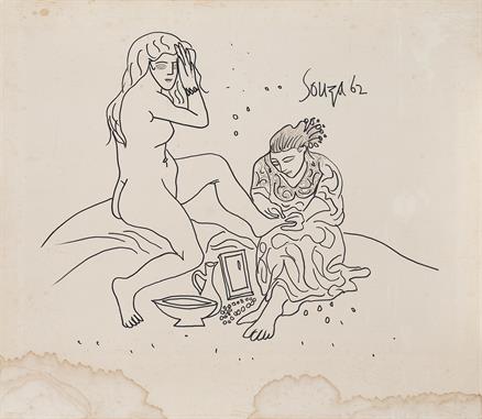 In the present lot, Souza depicts the famous scene Bathsheba at her Bath from the Hebrew Bible, which narrates the story of how King David was enamoured by the beauty of the Bathsheba, wife of one of his soldiers, Uriah. After he seduces and impregnates her, David sends Uriah to the battlefront, leading to his death, and leaving the king free to marry Bathsheba. This scene has been the subject of interpretation by many artists over the centuries, but none so famous as Rembrandt's Bathsheba at Her Bath (or Bathsheba with King David's Letter), which he finished painting in 1654 and is currently part of the collection of The Louvre in Paris. While most paintings depict Bathsheba bathing outdoors as David spies on her from a distance, Rembrandt's version offers a powerfully intimate gaze of Bathsheba suffused in soft light against a dark background, allowing her to be the subject of the canvas in a way she had not been depicted before. In Souza's work, he deliberately strips away the sensuality and realism of Rembrandt's work, choosing rather, to portray his subject in stark lines, with minimal detail. In his formative years, Souza had discovered in classical Indian art, particularly Khajuraho sculptures, "a tradition of erotic art incomparably more sensitive and pure" than the academic art taught in Bombay. (Edwin Mullins, F N Souza, London: Anthony Blond Ltd., 1962, p. 44) Of works such as the present lot, Mullins says: "These are not really erotic paintings in the true sense, but variations of a conventional theme explored by European artists... His nudes are only occasionally painted as beautiful or even as graceful...On the whole his paintings of nudes are more gentle that most of his other work; they have less impassioned ferocity about them. At the same time they are often the most perverse and obsessed... They suggest a personal fascination with the female body..." (Mullins, pp. 42-43) The present lot was painted a year after Untitled (after Titian's Venus of Urbino and Manet's Olympia), in which Souza interprets the famous depiction of the Roman goddess luxuriously reclining in his own style. Both works forms a connection between the European art tradition and Souza's personal life, demonstrating how aptly he is able to manifest his own distinct personality on a subject that has been variously interpreted by Western artists over time.