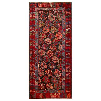 Handwoven by a local weaver most likely belonging to a Christian-dominated enclave within the Karabagh (Black Garden) region between Armenia and Azerbaijan, this carpet depicts a wildly colourful composition of flowers in full bloom set against a black background. Often referred to as gol firangi by the weavers, a label that literally translated to 'flowers for the foreigner', these carpets were extremely popular in the West, particularly Europe, at the turn of the 19th/20th century. The top left side of the carpet includes a date (1896) and the initials of the weaver who is believed to have woven it in English and Cyrillic. The central field of flowers is surrounded by three borders containing scrolling vines and additional flowers.