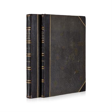 Owen Jones and Goury Jules, Plans, Elevations, Sections, And Details of The Alhambra: From Drawings Taken on The Spot In 1834 By the Late M Jules Goury and in 1834 And 1837 By Owen Jones Archt. With A Complete Translation of The Arabic Inscriptions, And Historical Notice of The Kings of Granada, From the Conquest of That City by The Arabs To The Expulsion Of The Moors, By Mr Pasqual De Gayangas , London: Owen Jones, 1842-45. 2 volumes. Physical Description 2 vols. [v.I: [12, 20, [100] p., add. t.pl., 51, [1] pl. (the plates not carrying numbers but assigned numbers in the List of Plates): illus. - v.II: [4] p., add.t.pl., 50 pl.]; 583 mm. Contents Vol. I: [Prelim. p. with French verse, add. t.pl., t.p., dedic.] - Advertisement - List of Subscribers - List of Plates - Historical Notice - [Plates, with explan. texts]. - Vol. II: [Add. t.pl., t.p.] - List of Plates - [Plates]. In Volume I the added title-plate is unsigned, as are also pl. 10, 46, 49, 50 and the unnumbered plate at the end. Pl. 47 and 48 are signed as drawn by Enrique. All other plates are signed as drawn by Owen Jones or Jules Goury or by both. Some plates are signed as engraved by W.S. Wilkinson, E. Kennion, T.T. Bury or Carl Rauch; a few as lithographed by F. Finlay or Owen Jones. Most chromolithographed plates are signed as lithographed by Owen Jones, but a few are unsigned by a lithographer, and one is signed as lithographed by J. Johnson. Most plates carry the printer / publisher's imprint of Owen Jones. Two pl. are signed as printed or lithographed by Day & Haghe. One engraved pl. carries the imprint of Gaywood & Longworth. Two in-text illustrations are signed - one relating to pl. 23 as made by Henry Vizetelly, one relating to pl. 46 by F. Branston. The printer is named on the t.p. verso: 'London: Vizetelly Brothers And Co. Printers, 135 Fleet Street.' The work is dedicated by Owen Jones to the memory of Jules Goury. In Volume II the added title-plate and all plates are unsigned by draughtsman or lithographer. All other plates other than the added title-plate carry the publisher's imprint of Owen Jones. (Source: www.royalacademy.org.uk ) Contemporary half-green morocco and marbled paper covered boards, spine gilt with raised bands, all edges gilt. 26.8 x 20.2 x 2 in (67 x 50.5 x 5 cm) (each) Large paper copy of the first edition of this highly detailed and beautifully produced work. According to Abbey this work was first published in two forms: small paper for £18.16s (as the Abbey copy) or £31.10s for the large paper issue as the present lot copy. Abbey does not mention if there were any other differences in the make-up of the two issues, but the plates on India paper found in this lot (which are not in the Abbey copy) are only found in the large paper issue.Plans, Elevations, Sections, and Details of the Alhambra by Owen Jones is a detailed survey of the Alhambra in Granada, Spain and is notable for being a highly important historic record of the architectural structure as it stood in the 19th century, decades before it was photographed in detail for the first time. The lithographs, printed in colours, are particularly important for being early experimental examples of the chromolithographic process that would dominate colour lithography for most of the second half of the 19th century. Jones’ fascination with Islamic architecture was sparked by his tour of the Middle East in 1833. He further toured Spain, particularly visiting the Alhambra the following year, accompanied by the French architect Jules Goury. The two were fascinated by the Moorish Palace, and studied it in great detail, producing comprehensive drawings of the architectural and decorative elements of the structure. While Goury tragically passed away during their stay prompting Jones to return to England, the latter visited the Alhambra again in 1837 to finish their documentation of the palace. Following his return to England with his drawings, Jones set up his own press to publish the work with the help of the firm Day & Haghe, undertaking an approach to colour-printing that is notable even today for being highly indicative of his exceptional skill and eye for design and architecture. NON-EXPORTABLE
