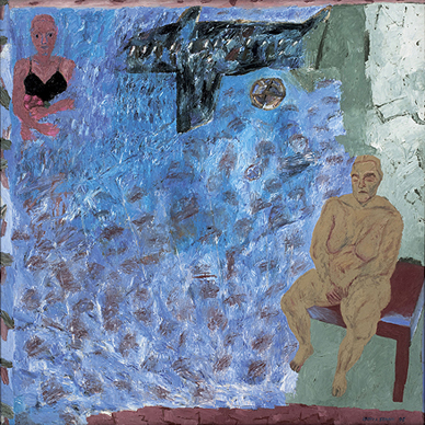 In the present lot, Singh excavates her subjects from the thick layers of oil paint that she uses to build and decorate her surface. While the private feminine realm and the ideas of human vulnerability and frailty are explicit in her portrayal of an aged and naked woman in the lower right corner, they are diametrically opposed – to the extent of almost being edged out of the frame – by images from other, more public realities. Against a vast blue textured ground, unlike the grey decaying wall that the subject leans on, these images speak of holidays, youth, departures, violence and love.