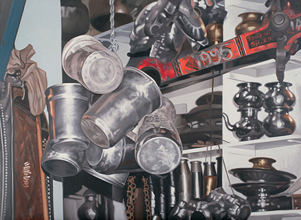 In the present lot, Gupta juxtaposes the polished with the tarnished, the new with the old, bringing into focus the dualistic quality of stainless steel that Nagy speaks of, and, by extension, the dualities of life in India following the country’s dramatic economic liberalization in the 1990s. Pushing the viewer to question value, and the unique ways in which it is translated from traditional to contemporary contexts, the artist offers a striking visual of the interior of a trader’s stall, where used vessels and other household goods are weighed and bartered for new ones. A common practice in India, this scene foregrounds the importance of outliers and departures from the flattening norms of globalization, and the immense significance of the local within the ascendant global matrix.