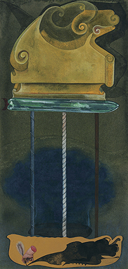 The artist's diverse oeuvre, including miniaturist works in gouache, cut up paintings rearranged as visual puzzles, and large sculptural installations, is animated by a sense of the surreal. There is the simultaneous exploration of the mundane and the phantasmal, the ridiculous and the horrific. The seduction and intimacy offered by these works, far from being repellent, actually invite acquisition by providing a perfect frame for private fantasy. Ray calls himself a ‘surface painter’, subscribing to an enjoyment which does not presume to judge. Incidents of illogical violence scattered over the surface of a painting therefore metamorphose into decorative detailing, finding complete acceptance in our minds.
