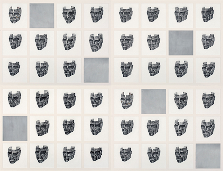 This work comprises forty eight parts, including six acrylic mirrors, with each measuring 10 x 10 inches. It is framed in four separate panels, each panel comprising twelve parts.