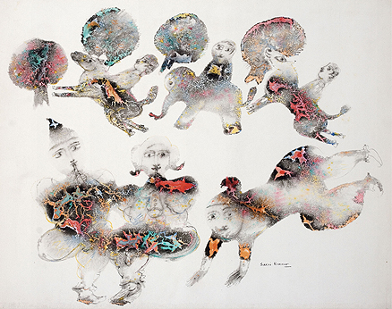 Born in Kolkata in 1935, Sakti Burman studied at the Government College of Arts and Crafts, Kolkata, and later at the École Nationale des Beaux Arts in Paris. Burman uses pointillism and a marbling technique achieved by blending oils with acrylics to create fresco-like works on paper and canvas. Burman’s paintings often evoke a surrealist feel, referencing multiplicities of time and place. His art drew extensively from Hindu and European mythology, as well as from the artist’s own memories. Suggesting surrealism, his paintings are populated by humans, animals and cityscapes that are dreamlike in appearance. His defining oeuvre owes largely to his technique of marbling, which he arrived at after years of experimentation. Burman travelled to Italy in 1958 and his encounter with the frescoes of Giotto, Piero de la Francesca and Simone Martini inspired him to assimilate their monumentality and textures in his works.