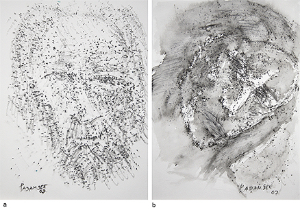 Padamsee’s interest in structure and form takes shape from landscapes, and is borne from an interest in Sanskrit texts such as the Abhijanashakuntalam . His Mirror Images reflect a concern with the duality of existence. His portraits and heads are treated with the same interest in constructing form rather than in the specifics of portraiture. The only occasion when he created identifiable portraits was in 1997, with his “Gandhi” series of works on paper in watercolour and charcoal.