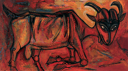 When one looks at Goud’s work, rustic, raw, and potent might be the first words that come to mind. His portraits of men and women represent the dynamic Indian ethos rather than particular individual identities. A recurrent theme with the artist is that of the erotic, treated as an active and powerful aspect of male and female sexuality and existence. Goud’s work is dramatic; his protagonists are raw and vivacious in their appeal, imbibed with energy that reverberates through his strokes and textures. Most of Goud’s art is centered on the rural, recreating landscapes from his childhood as if they were frozen in time. In the artist’s later work, his figures turn softer, more introspective than brash in their outlook.